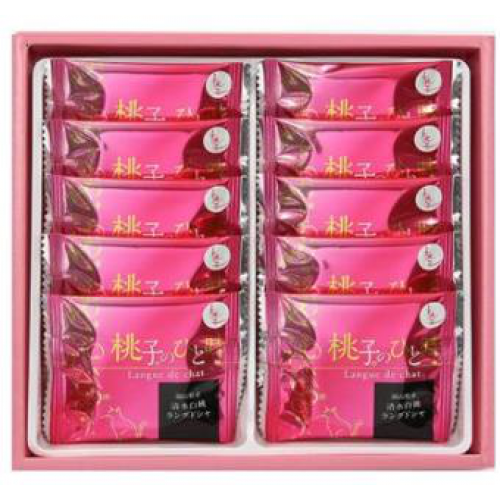These cat tongue cookies are made with the representative fruit of Okayama Prefecture, 'Shimizu White Peach.' The crispy cookies are made with Shimizu White Peach jam, carefully baked to preserve the original flavor of the peach. The chocolate cream sandwiched between the cookies also has the white peach flavor.